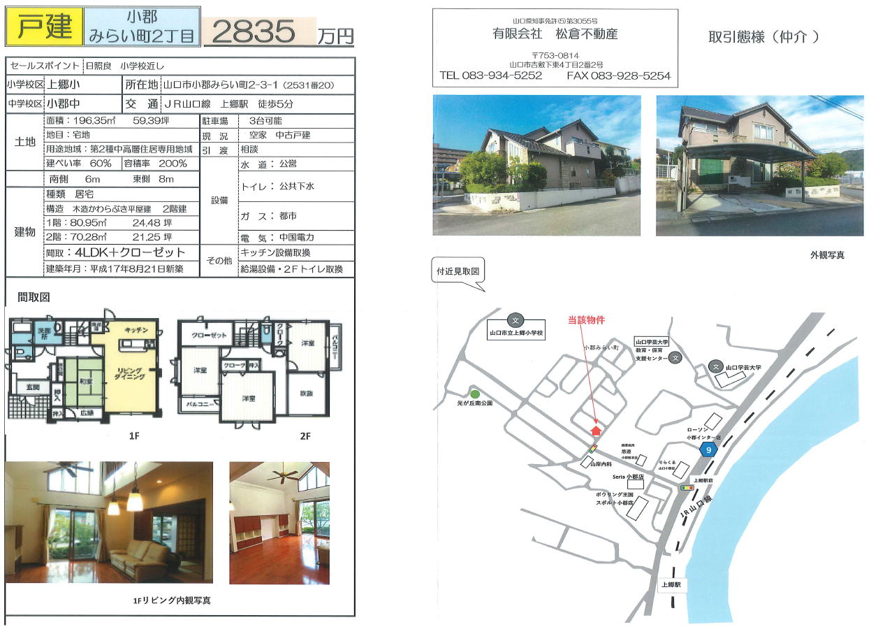 有限会社 松倉不動産〒753-0814 山口市吉敷下東4丁目2番2号 TEL (083)934-5252 FAX (083)928-5254 Mail : info@matukura-fudousan.com